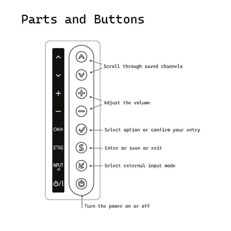 تشغيل الشاشة – التحكم بالصوت – تغيير القنوات – القائمة – الأزرار الجانبية.